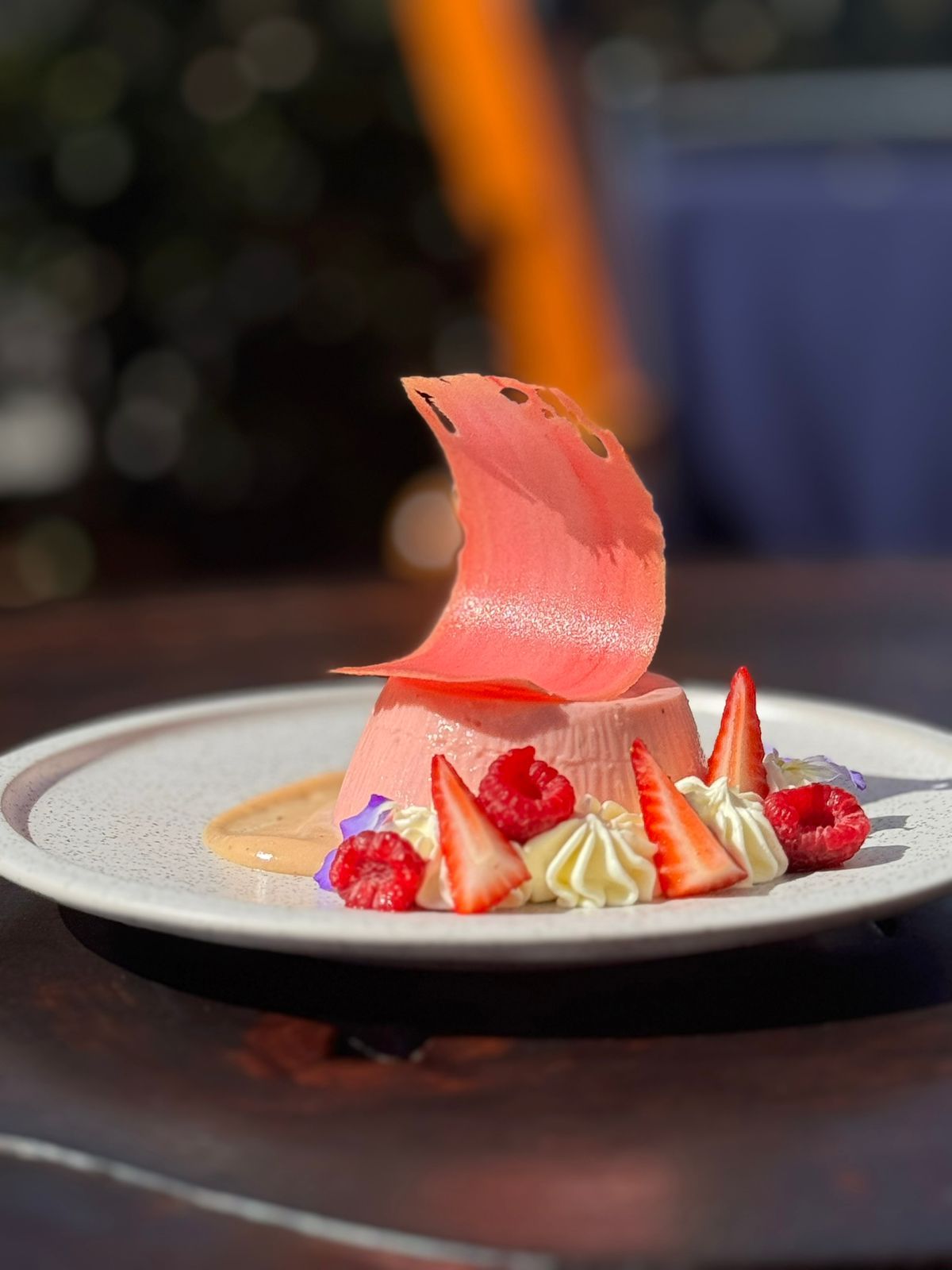 Se trata del postre “Pannacotta de frutilla con corazón de frambuesa y crema inglesa al cardamomo".