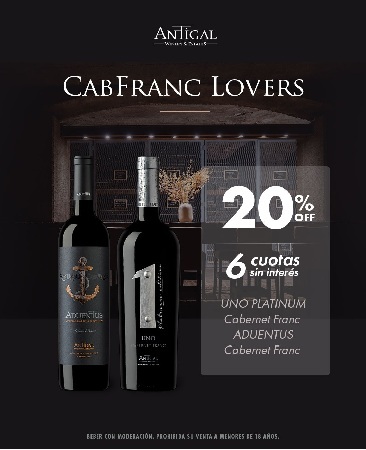 Durante la Semana del Cabernet Franc, quienes ingresen a tienda.antigal.com podrán disfrutar de un 20% de descuento y 6 cuotas sin interés en dos de las etiquetas más representativas de este varietal: UNO Platinum Cabernet Franc y Aduentus Cabernet Franc, incluyendo también la caja Mix Selección Cabernet.
